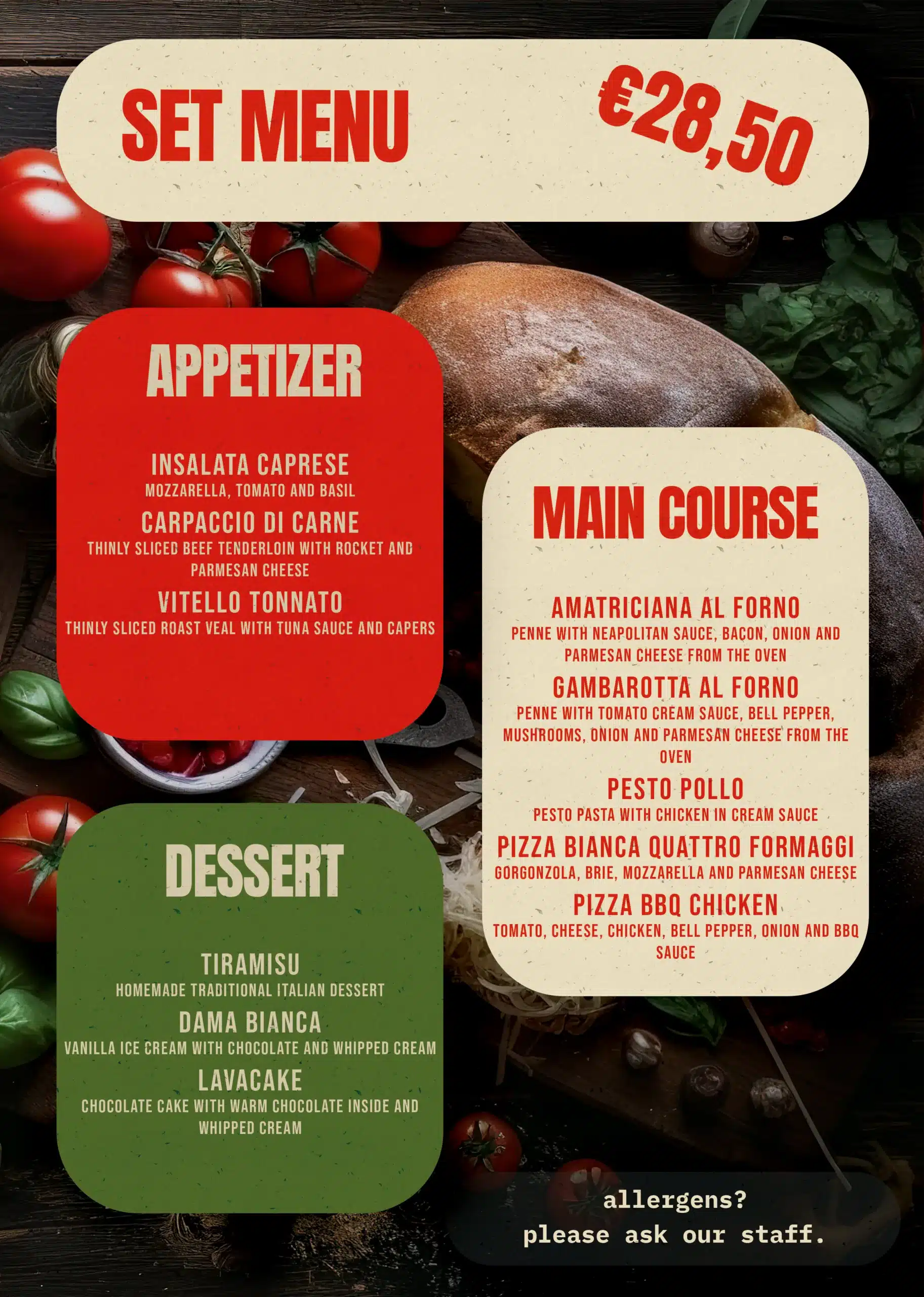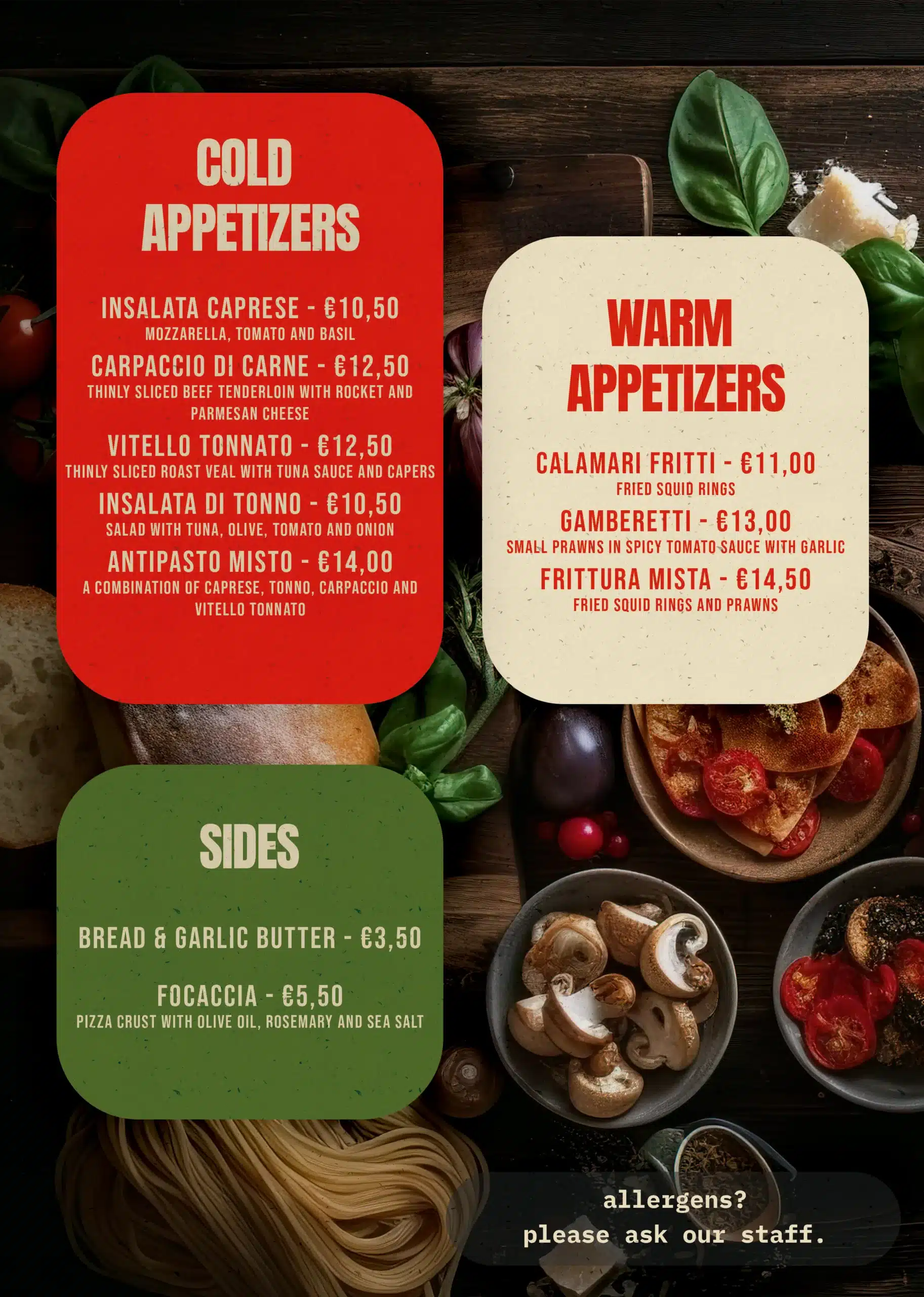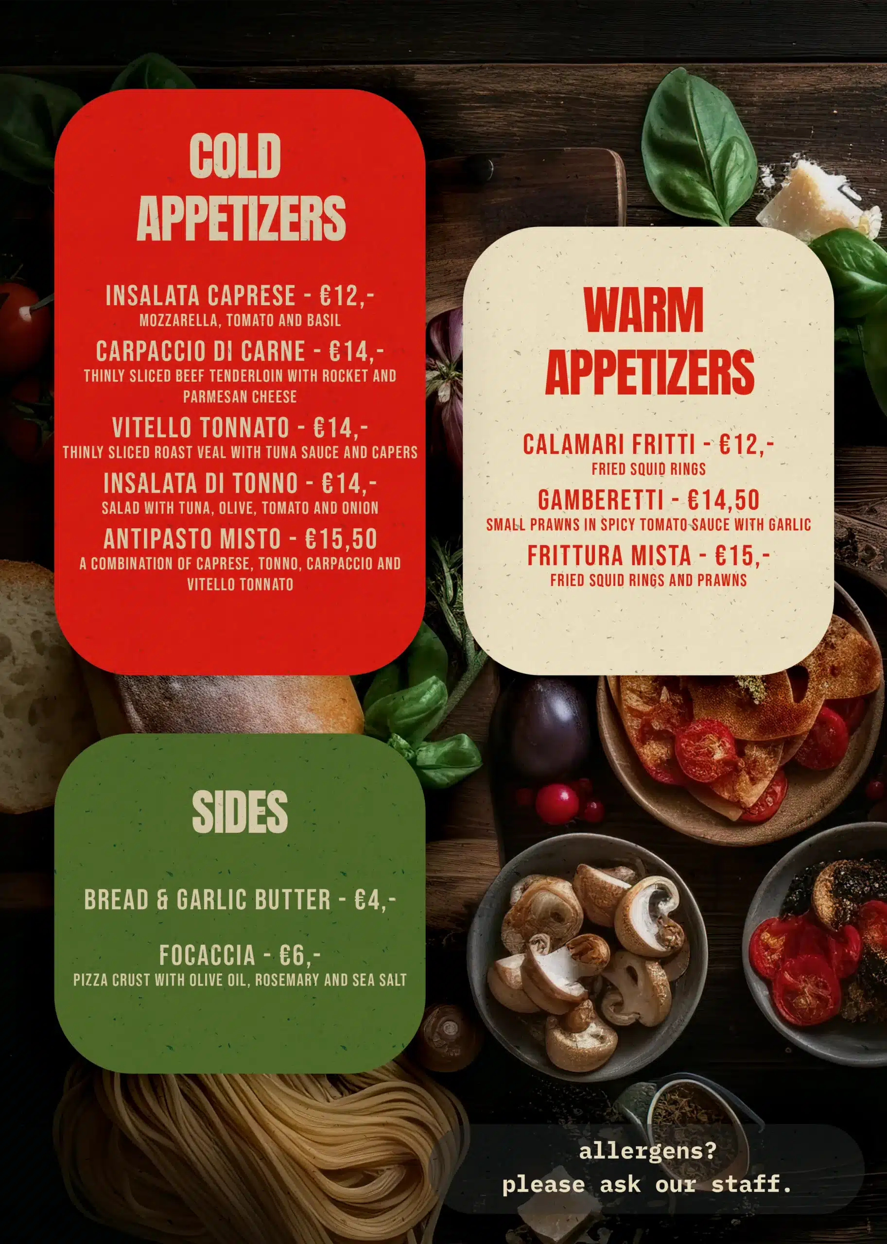 Buon cibo, Buon vino, Buoni amici. Slechts een beperkt aantal tafels beschikbaar — Reserveer vandaag nog!Openingstijden Maandag - Dinsdag - Woensdag: GeslotenDonderdag: 17:00–21:30Vrijdag: 17:00–21:30Zaterdag: 16:30–21:30Zondag: 16:30–21:00 Contact Akkerstraat 94811JL BredaNoord-Brabant 06-34014697 contact@dolceesalato.nl